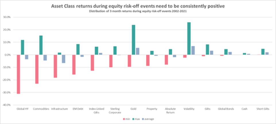 Historically, Volatility has offered the best and most consistent defence to significant equity risk-off events. Just look at the chart below. This shows the 3 month returns for a range of ‘defensive’ assets during the 30 most negative periods for equities between 2001 and 2021: