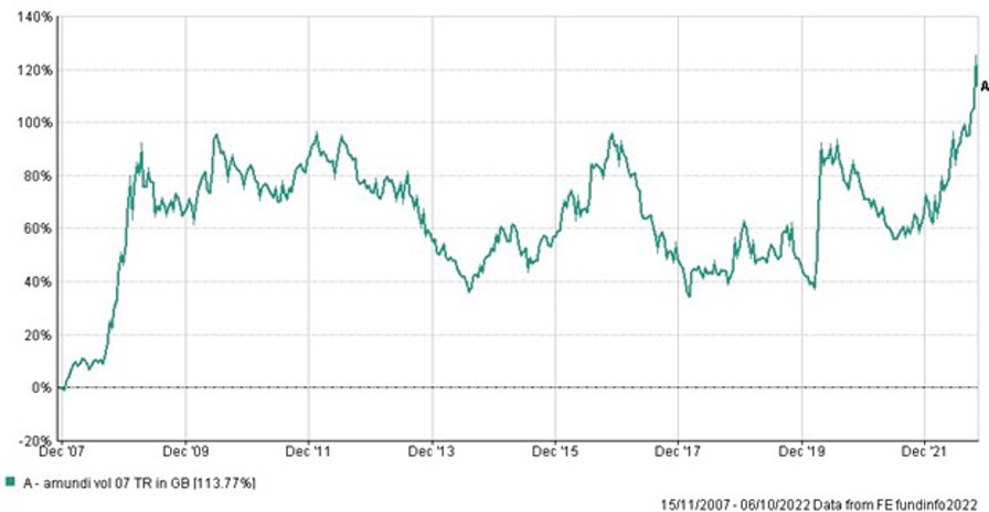 Below you can see the full history of returns from Amundi World Volatility – one of the longest running open-ended volatility funds.