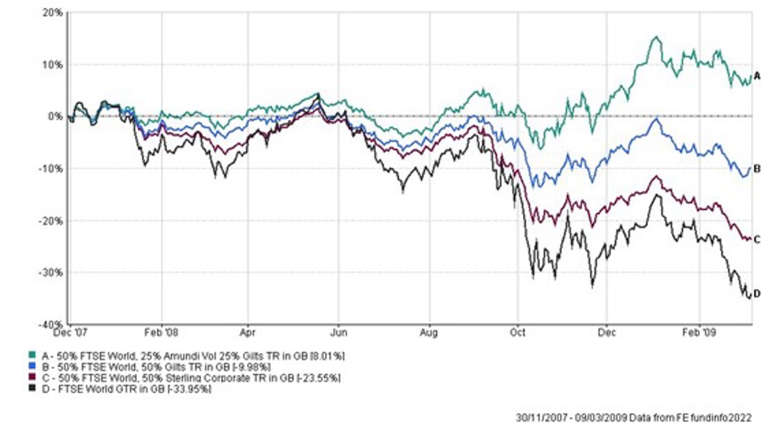- Line A (green) shows an allocation of 25% to Gilts and 25% to Amundi Volatility. The substantial upside from volatility meant that, at the lowest point, the portfolio was down only 6% while at the low point of equities it was up.