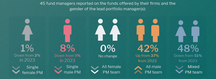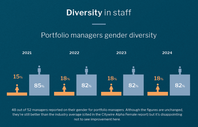 While it’s encouraging to see that our fund managers are still leading the way by continuing to employ more female portfolio managers than the industry average (Citywire Alpha Female 2023 report) very little progress has been reported in 2024.