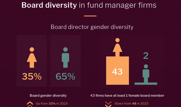 This also holds true at board level – board gender diversity has slightly improved from 33% of board members at our fund managers being female in 2022 to 35% in 2023. Positively though, almost half of the fund houses are exceeding the Hampton Alexander threshold - a recommendation for women to make up at least 40% of a board.