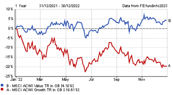 By all accounts, 2022 was a dismal year for both equity and bond markets. But looking at the chart below, you can see an investor in the MSCI World Value Index would have been one of few to have made a positive total return. In relative terms, value outperformed growth by a staggering 23.71%. An economic environment with healthy levels of inflation and interest rates lends itself to value investing. If we stay in that environment for some years, it is likely that value investing could do well.