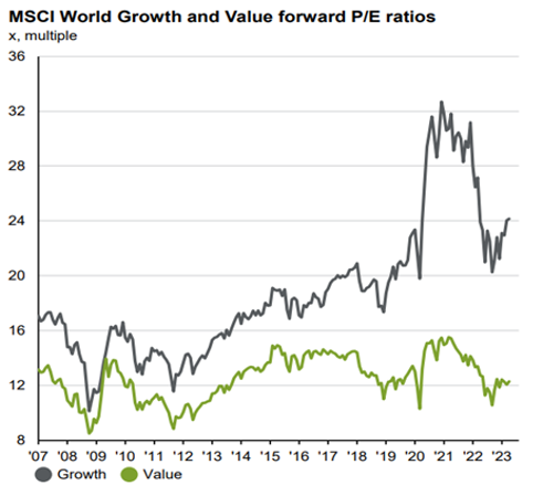 There are pros and cons to each case. While growth may have struggled recently, it’s worth noting that interest rates might be near their peak. This means the outlook for growth should improve looking ahead as expectations are for a fall in interest rates over the coming year, especially in the US. But as inflation and interest rates are unlikely to fall to zero (unless we experience another shock) the outlook for value also remains positive.